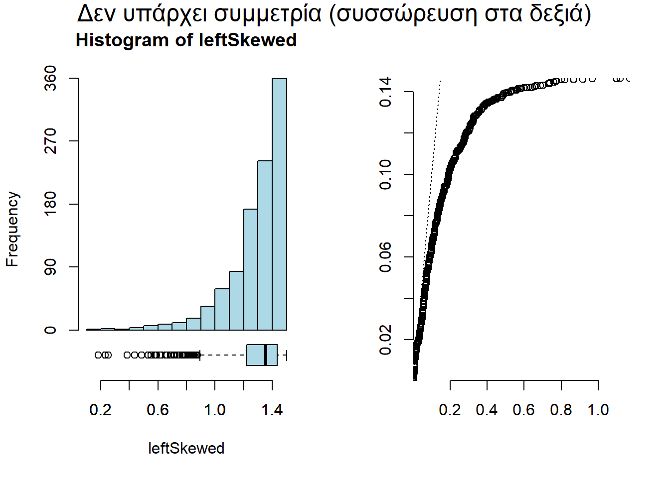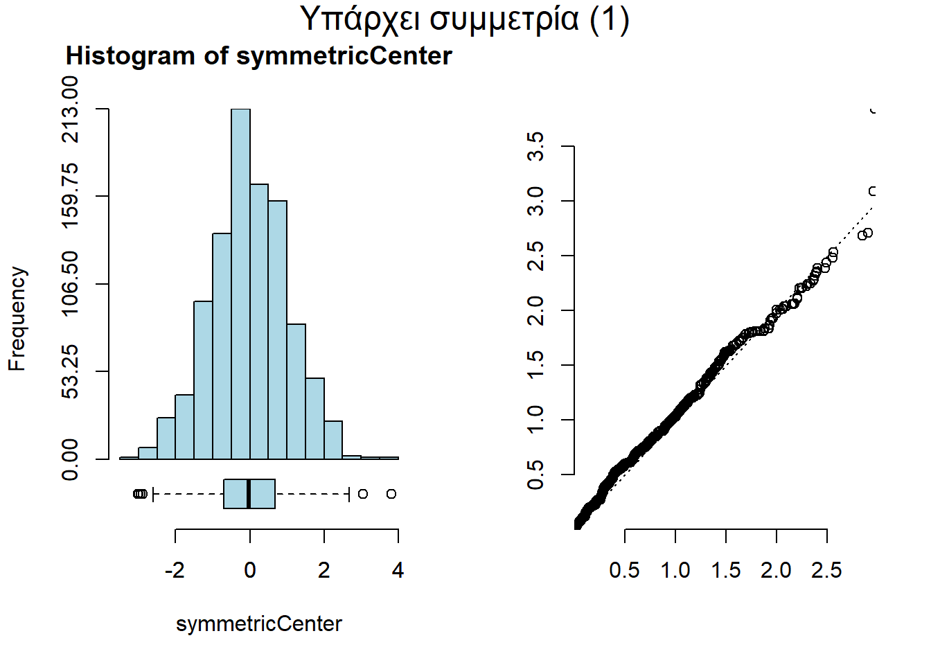Το γράφημα ασυμμετρίας μοιάζει πολύ με το γράφημα Q-Q, που θα δούμε πιο μετά, αλλά δεν είναι το ίδιο. Αυτό είναι εξειδικευμένο στο να ανιχνεύει τη συμμετρία, ενώ το Q-Q στο να ανιχνεύει αποκλίσεις από την κανονική ή άλλες κατανομές. Πάντως, και σ’ αυτή την περίπτωση, το «κλειδί» είναι να είναι το γράφημα σχεδόν ευθεία γραμμή. Άπαξ και είναι ευθεία γραμμή, τα δεδομένα μας είναι συμμετρικά.