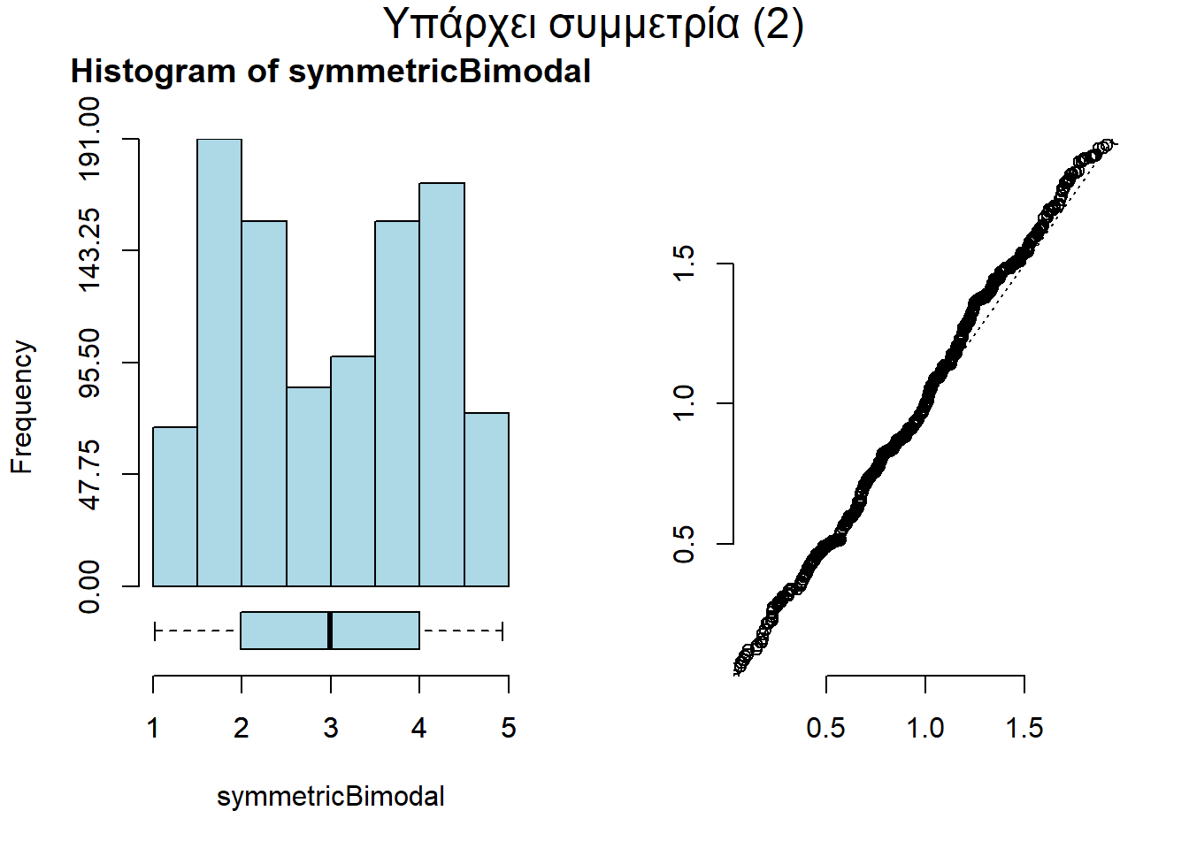 Είδαμε στην προηγούμενη ενότητα ότι το ιστόγραμμα είναι μια καλή αφετηρία, για να δούμε γραφικά την ασυμμετρία που μπορεί να έχει ένα σύνολο δεδομένων. Θα ήταν πολύ πιο χρήσιμο, αν μαζί με αυτό υπήρχε κι ένα θηκόγραμμα (βλ. υποενότητα Θηκόγραμμα), που να δείχνει πού είναι συγκεντρωμένη η μεγάλη μάζα των δεδομένων. Προς τούτο θα χρειαστούμε το πακέτο packHV, οπότε γράφουμε: