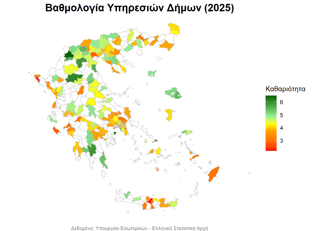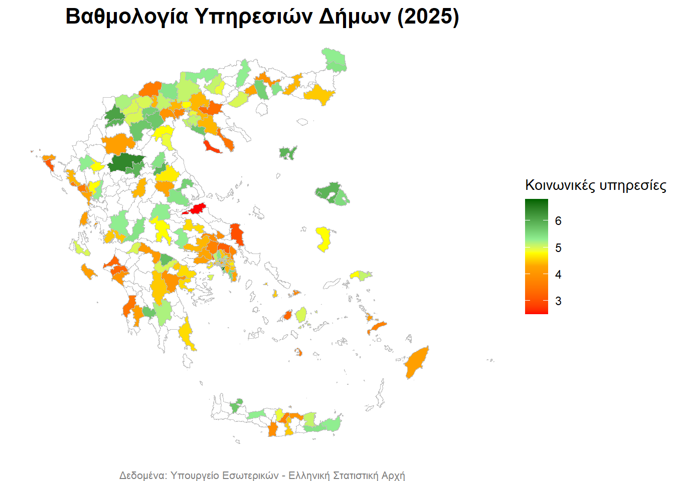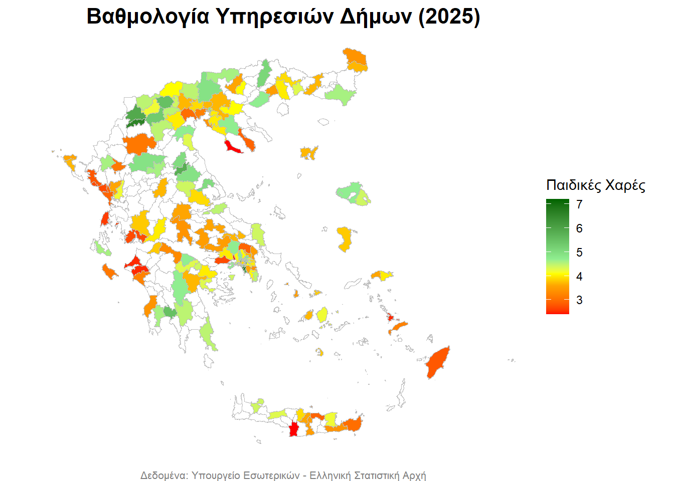 - με σκούρο πράσινο οι Δήμοι με την καλύτερη βαθμολογία,