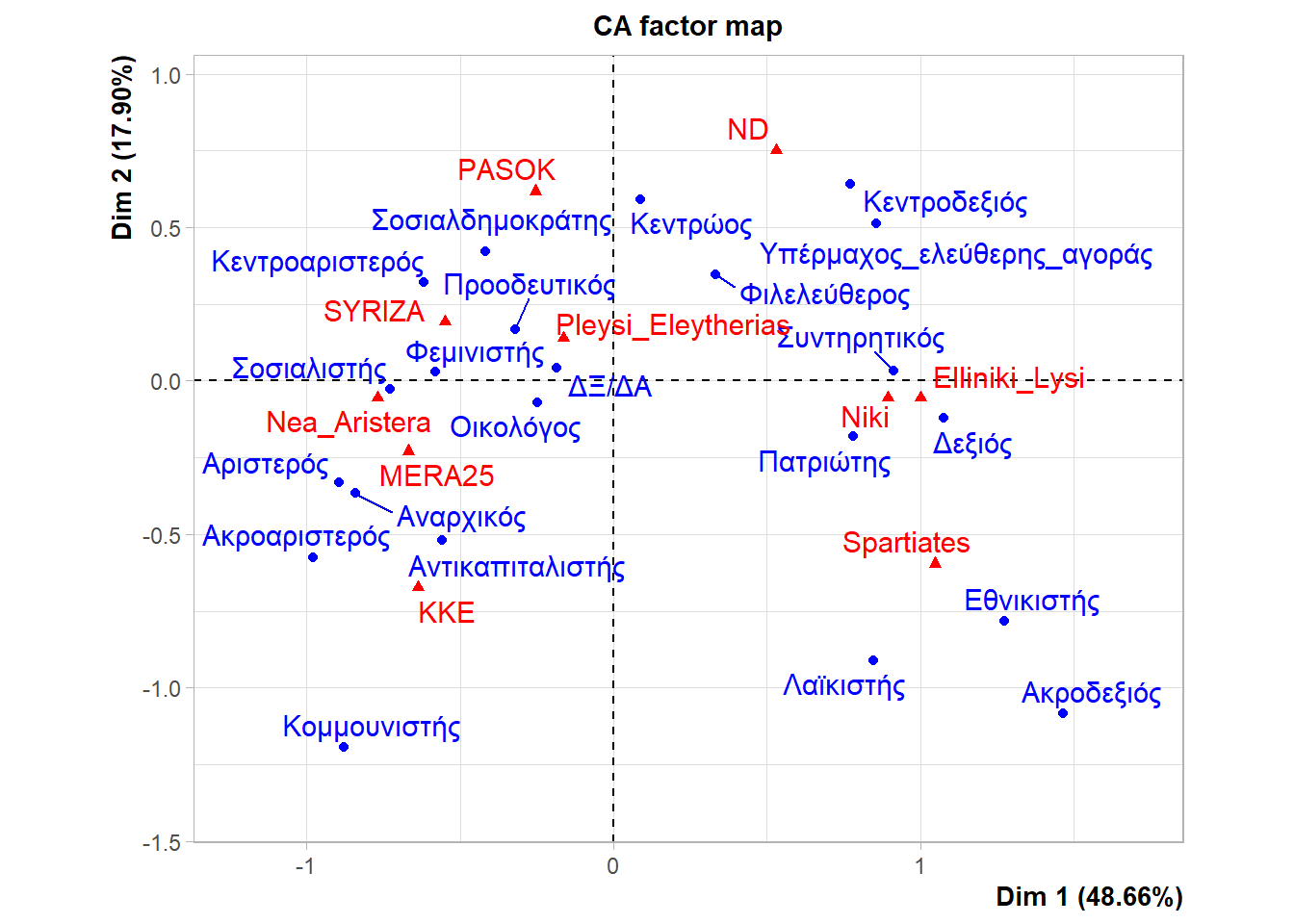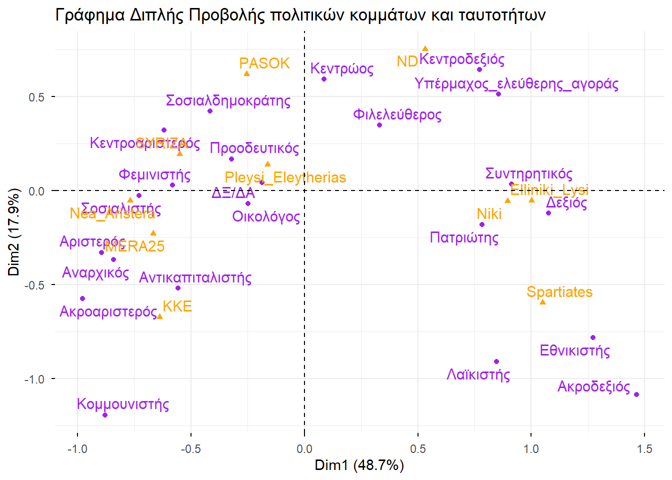 Πόσο καλά καταγοριοποιούνται κόμματα και πολιτικές ταυτότητες από δύο μόνο άξονες; Ας μην ξεχνάμε πως είχαμε 10 κόμματα και 22 πολιτικές ταυτότητες, ήτοι 220 πιθανούς πολιτικούς χαρακτηρισμούς. Αυτό έρχονται να μας το αποκαλύψουν τα ποσοστά που αναγράφονται στους άξονες. Το γράφημα διπλής προβολής μάς λέει ότι η μία διάσταση (Dim 1) αρκεί για να εξηγήσει το 48.66% των δεδομένων μας. Η επιπλέον διάσταση (Dim 2) είναι για να εξηγήσει το επιπλέον 17,90%. Συνολικά εξηγούν το 66.56% των δεδομένων μας.