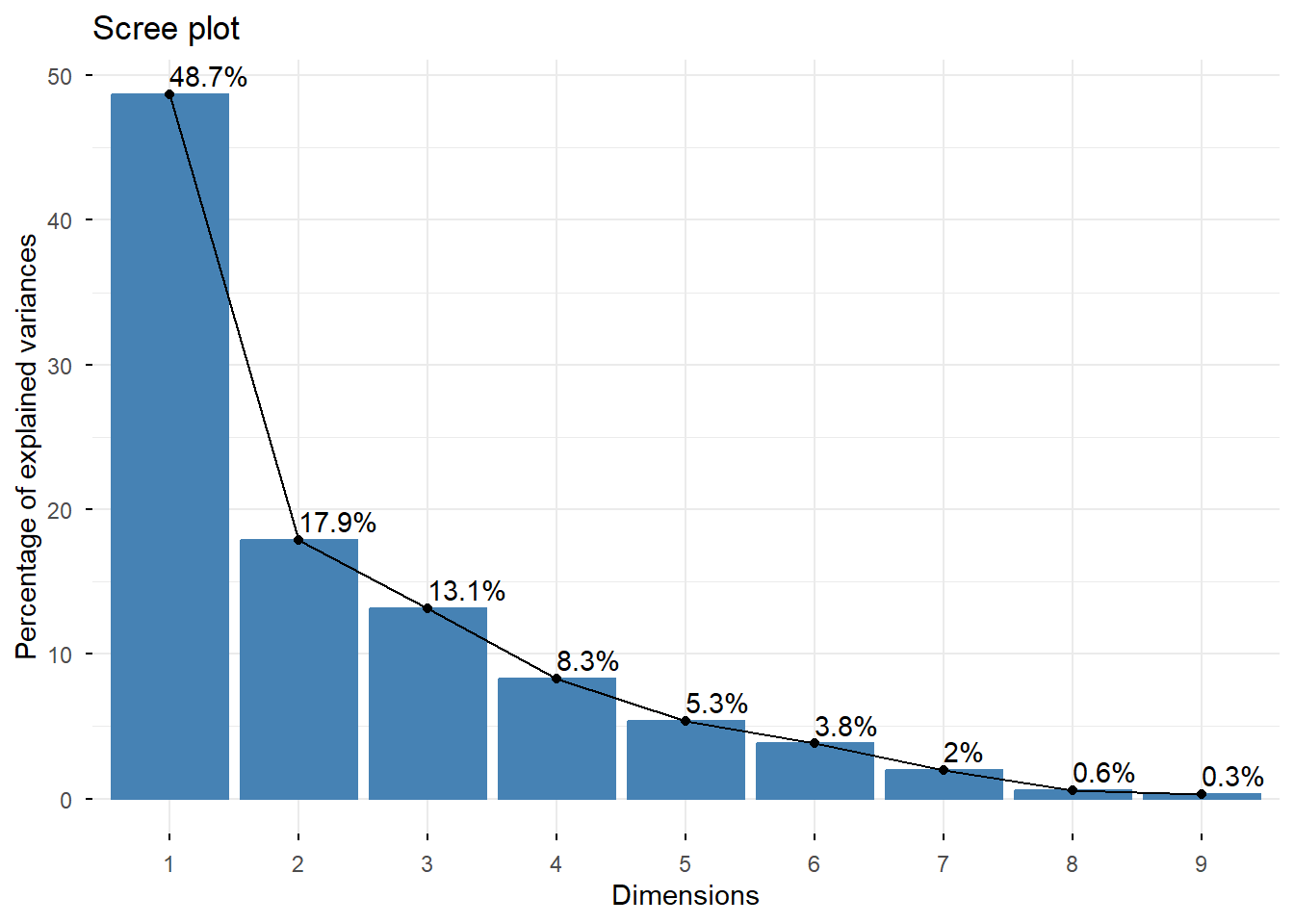 Αν στον αναγνώστη το 66.56% φαντάζει φτωχό, μπορεί να προσθέσει καινούριες διαστάσεις. Το πόσες θα πετύχουν την ακρίβεια που επιθυμεί, θα του το αποκαλύψει η συνάρτηση fviz_eig(), η οποία φτιάχνει το λεγόμενο γράφημα παραγόντων. Έχοντας ✍️✍️✍️ τα αποτελέσματα της 1ης ανάλυσης που κάναμε (εδώ έχει όνομα apotelesmataCORA) και γράφοντας fviz_eig(✍️✍️✍️, addlabels = TRUE), βλέπουμε πόση πληροφορία προσθέτει η κάθε επιπλέον διάσταση και προσθέτουμε τόσες, όσες απαιτεί η ακρίβεια που επιθυμούμε.