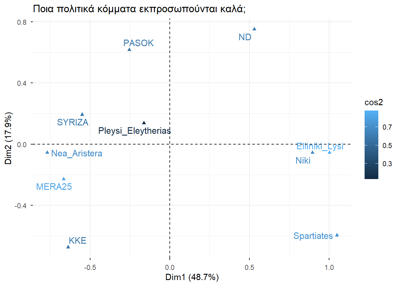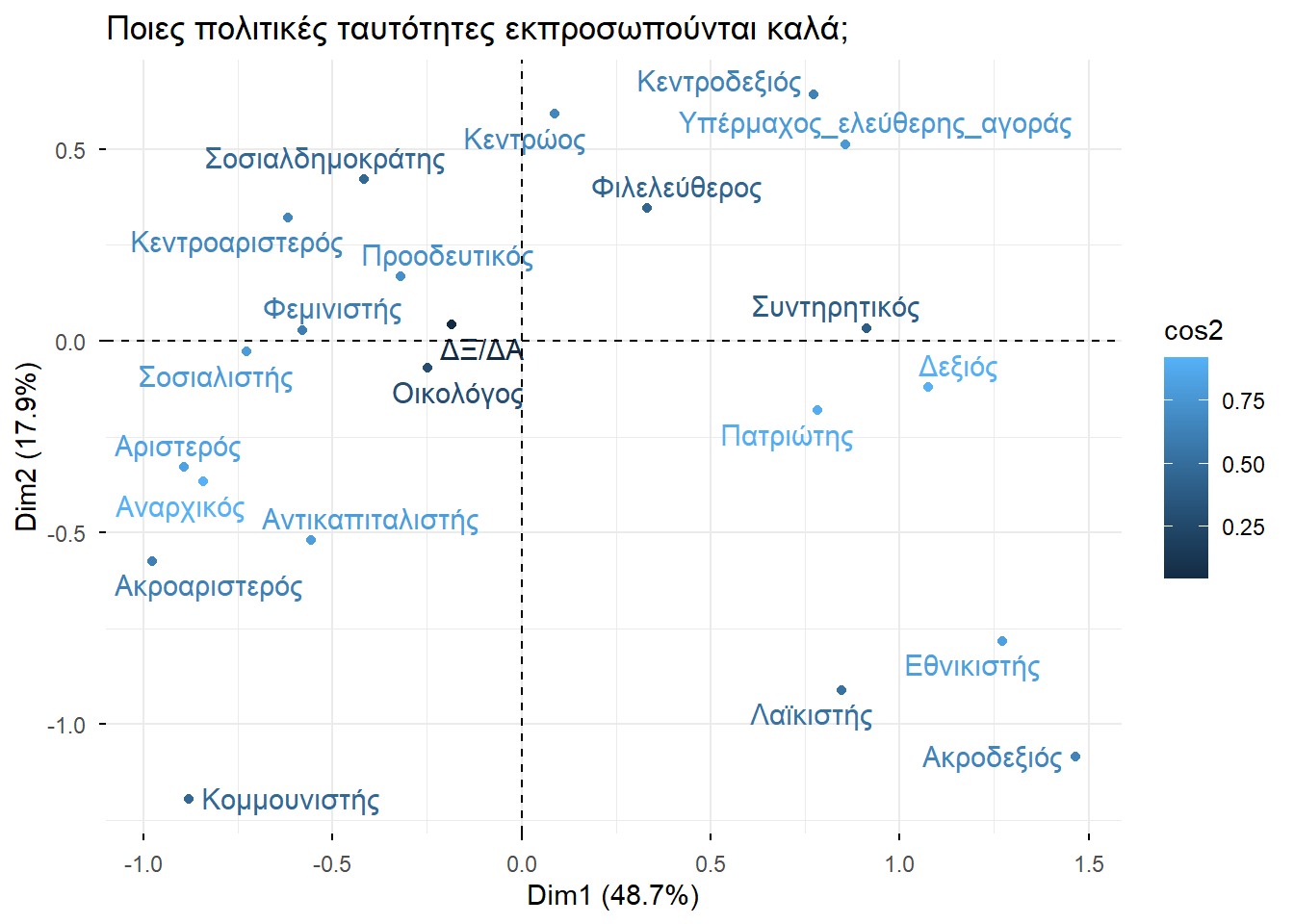 Ένα θέμα που μπορεί να μας απασχολήσει, είναι το πόσο καλά περιγράφονται τα κόμματα και οι πολιτικές ταυτότητες από τους άξονες. Δεν είναι σε κάθε κόμμα και σε κάθε πολιτική ταυτότητα η ίδια απάντηση. Σε αυτό θα μας βοηθήσουν τα παρακάτω γραφήματα (βλ. cos2).