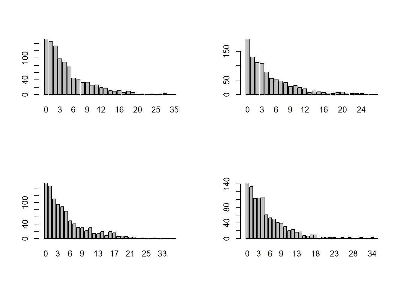 Θα παίξουμε (θεωρητικά, προφανώς) αυτό το «παιχνίδι» αρκετές φορές, και θα δούμε σε πόσες από αυτές χρειάστηκαν 0, 1, 2, 3 κτλ φορές μέχρι να εκπυρσοκροτήσει το όπλο και ν’ αφήσουμε για πάντα τον κόσμο ετούτο. Να σημειώσουμε εδώ πως κάθε φορά ξαραπεριστρέφουμε το θάλαμο του εξάσφαιρου, οπότε η πιθανότητα να μείνουμε ζωντανοί θα διατηρείται πάντα \(\frac{1}{6}\). Θα παίξουμε, λοιπόν, ρώσικη ρουλέτα μέχρι να χάσουμε, μετά θα ξαναπαίξουμε μέχρι να χάσουμε κ.ο.κ. για 1000 φορές. Αυτή τη 1000άδα θανάτων και νεκραναστάσεων θα την παίξουμε 4 φορές, για να δούμε καλύτερα τον παράγοντα «τύχη».