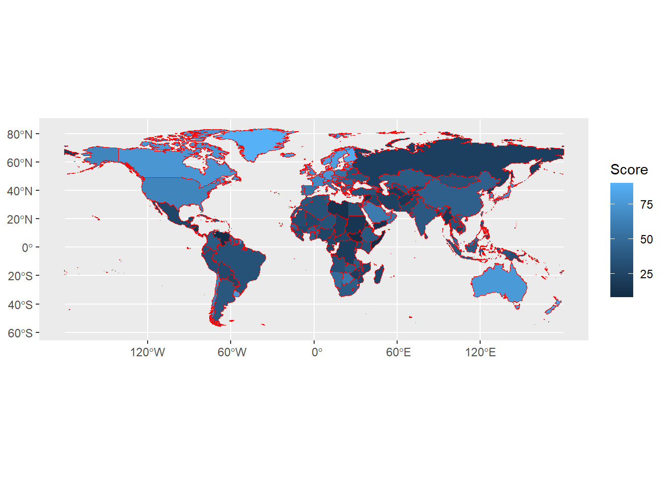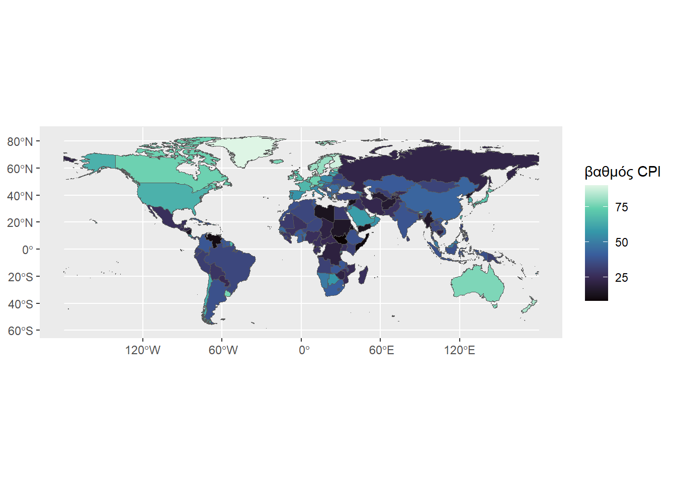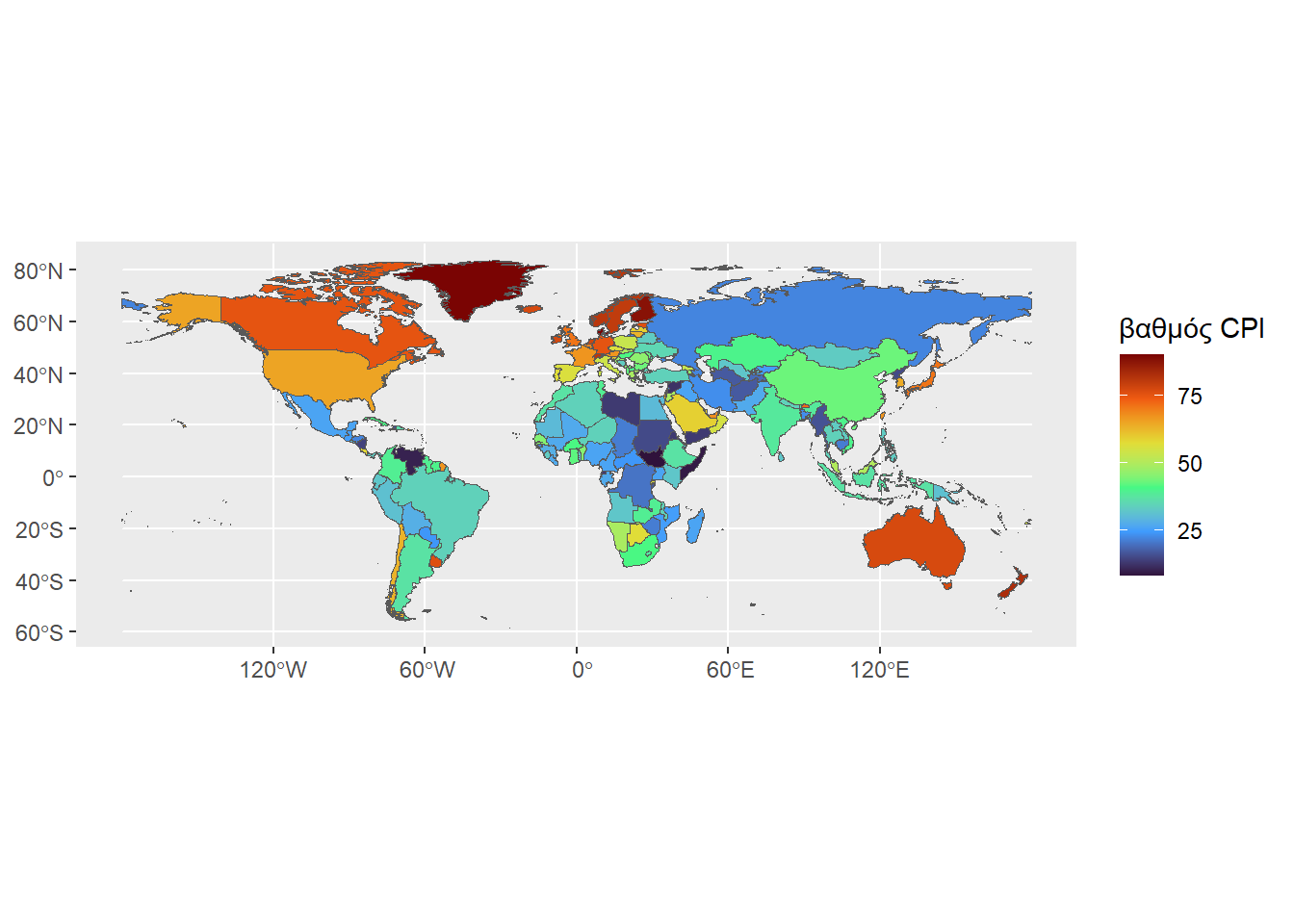 kentriko_simio <- mean(xartis_cpi$Score, na.rm = TRUE)Έτσι, έχουμε τον παρακάτω χάρτη, όπου για να χρωματιστεί παίζουμε με τις παραμέτρους low, mid, high και midpoint: