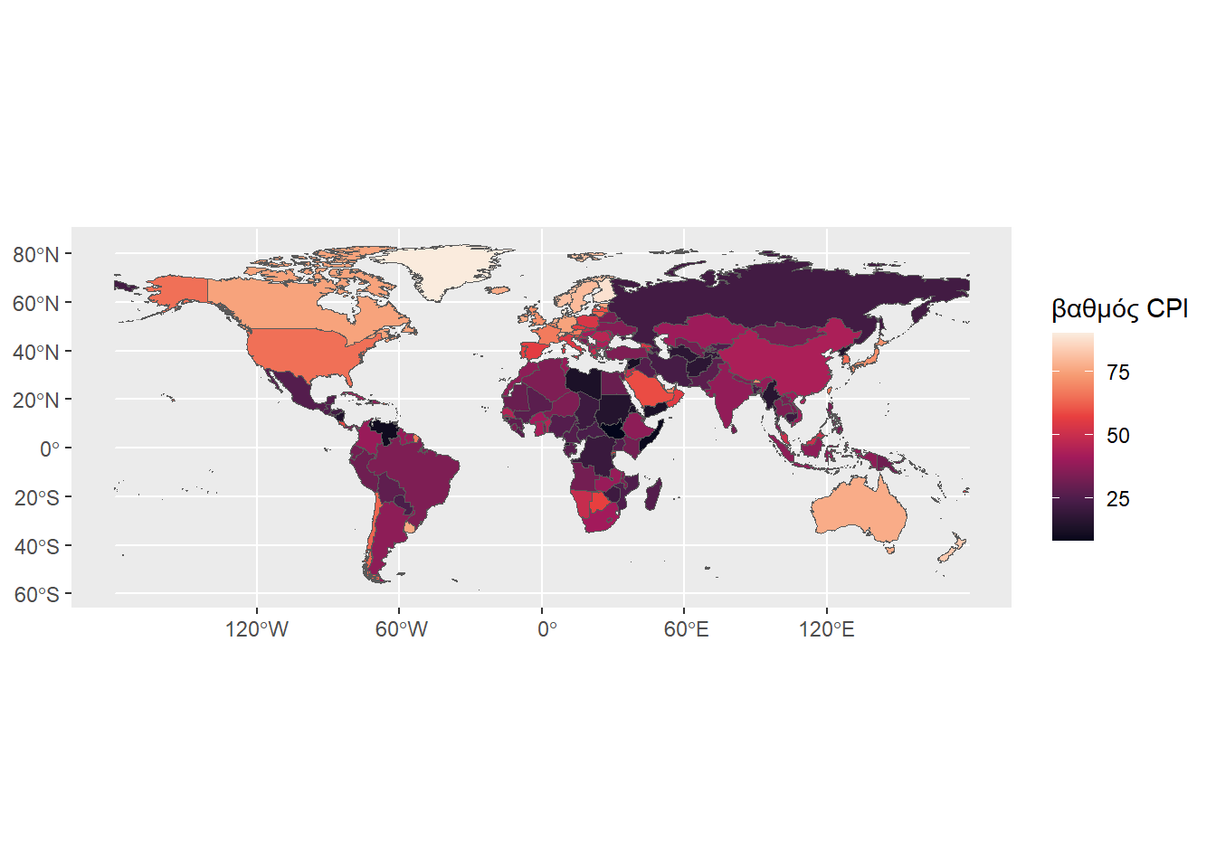 Ας προχωρήσουμε κι άλλο λίγο την επεξεργασία δίνοντας κόκκινο χρώμα στις χώρες με χαμηλή βαθμολογία και πράσινο σε αυτές με υψηλή βαθμολογία. Θα χρησιμοποιήσουμε τη συνάρτηση scale_fill_gradient2() του ggplot2. Πρώτα, όμως, θα πρέπει να ορίσουμε το ποιο θα είναι το κεντρικό σημείο. Εδώ θα θεωρήσουμε πως το κεντρικό σημείο θα είναι η διάμεσος των βαθμών CPI.