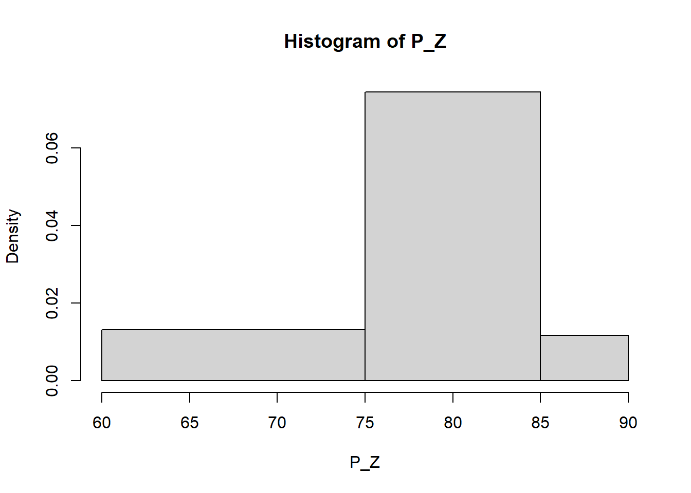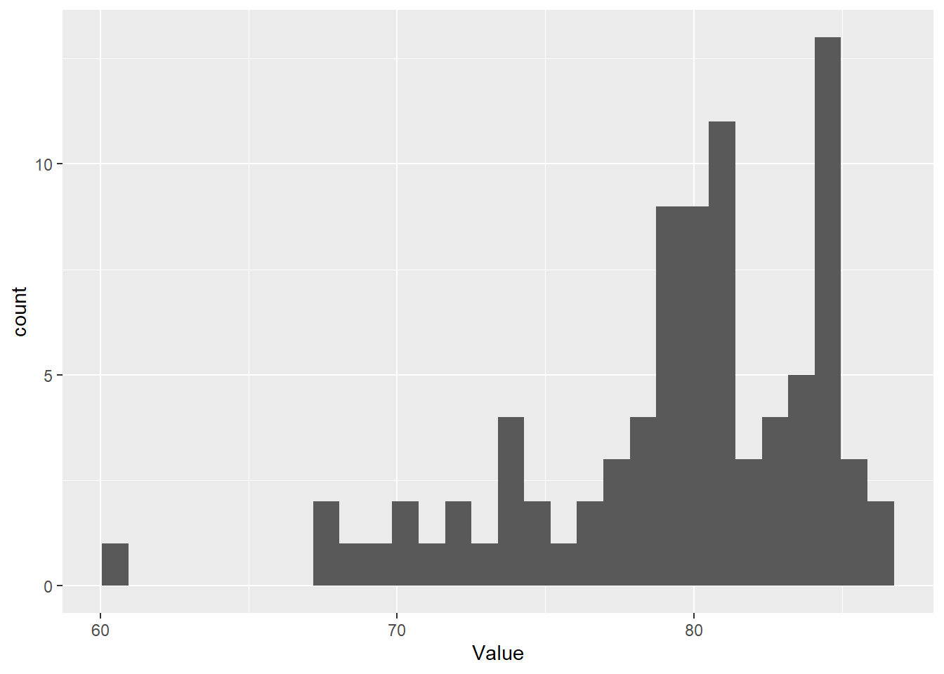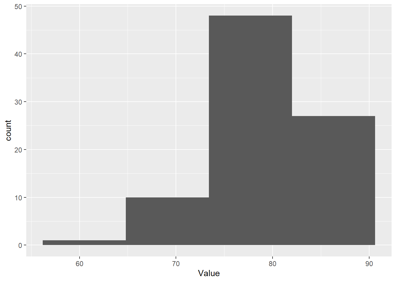 Τι δείχνει ένα ιστόγραμμα και ειδικότερα το συγκεκριμένο; Παρατηρούμε ότι οι τιμές της μεταβλητής Value του πίνακα P_Z, δηλαδή το προσδόκιμο ζωής κάθε χώρας, παίρνουν τιμές σε ένα συνεχές φάσμα. Ως εκ τούτου είναι απίθανο να βρούμε έστω και δύο χώρες με ακριβώς ίδιο προσδόκιμο ζωής. Όμως δεν θα είχε ιδιαίτερη αξία ένα ραβδόγραμμα που θα έδειχνε πως μία χώρα έχει προσδίκιμο ζωής τα 85,9 χρόνια, 2 άλλες τα 85,7, μία άλλη τα 85,6 κτλ. Έτσι δεν είναι; Θα ήταν πιο χρήσιμο το ύψος της κάθε μπάρας να δείχνει π.χ. πόσες χώρες έχουν προσδόκιμο ζωής 60-65 χρόνια, πόσες 65-70 χρόνια, πόσες 70-75 χρόνια κτλ. Ε, αυτό ακριβώς κάνει το ιστόγραμμα!