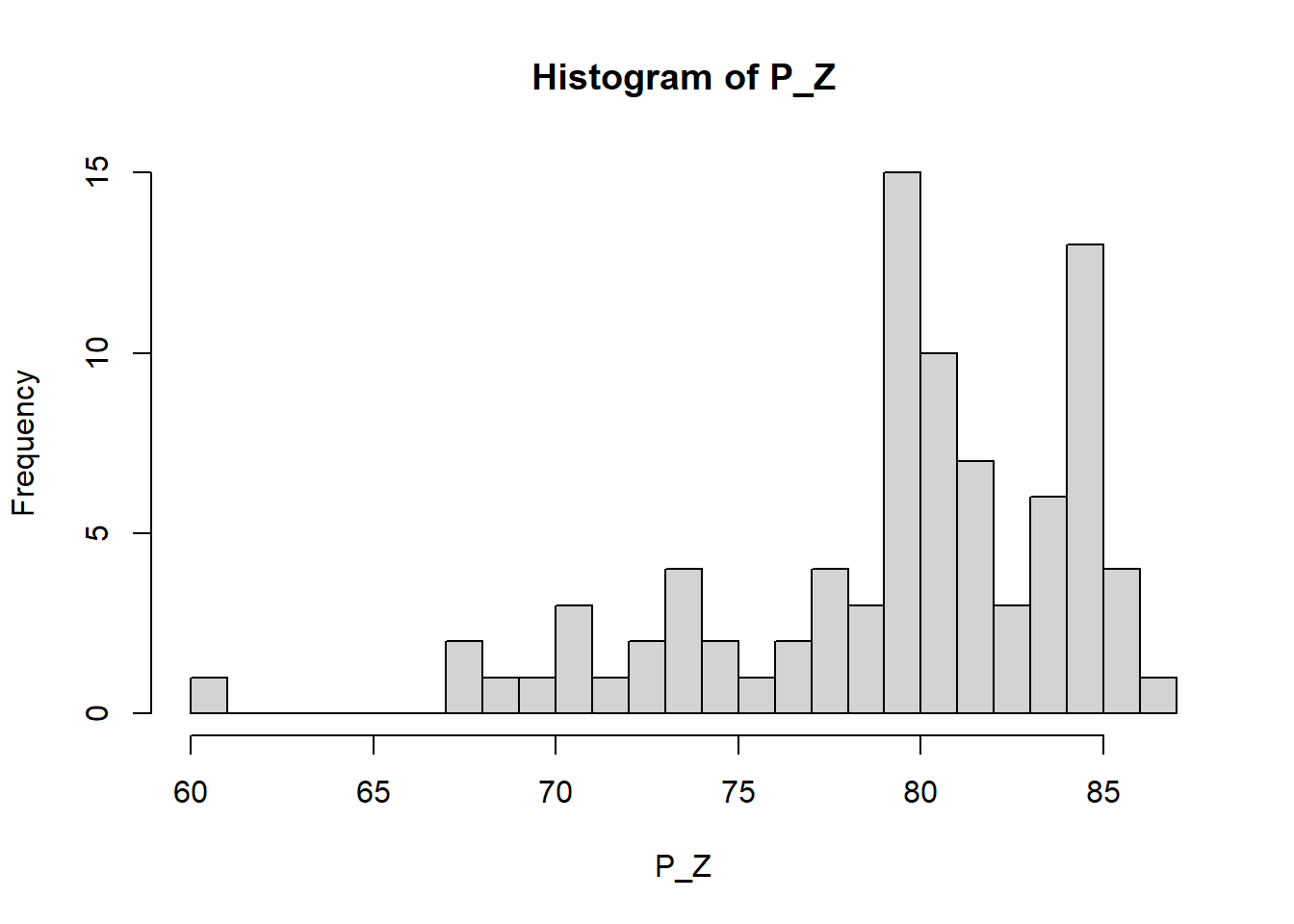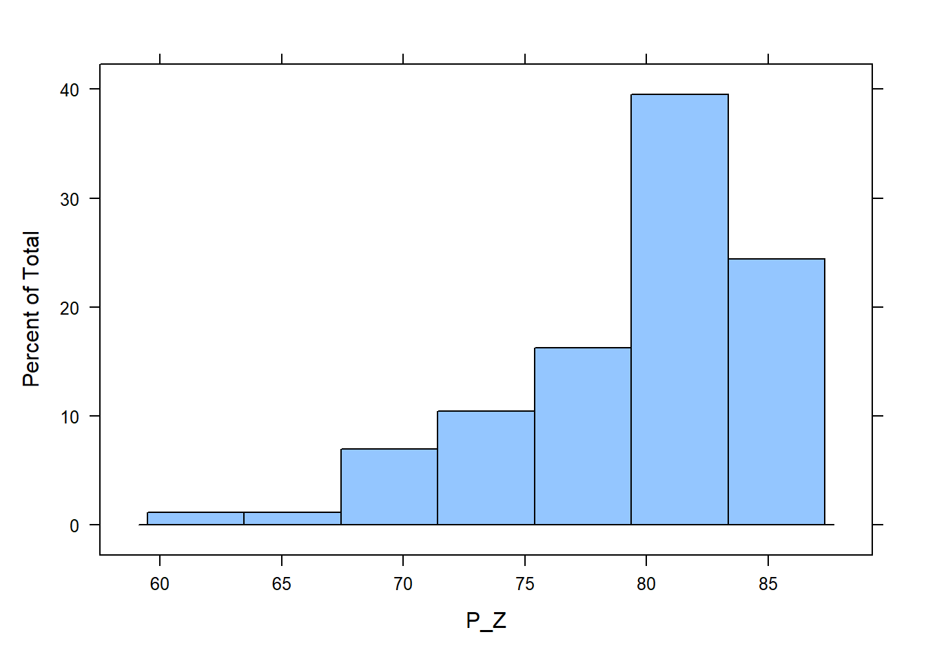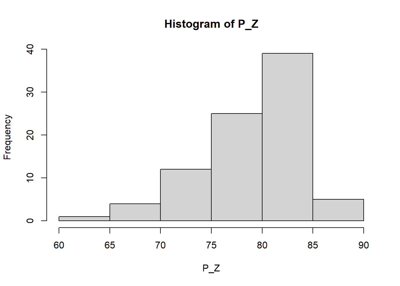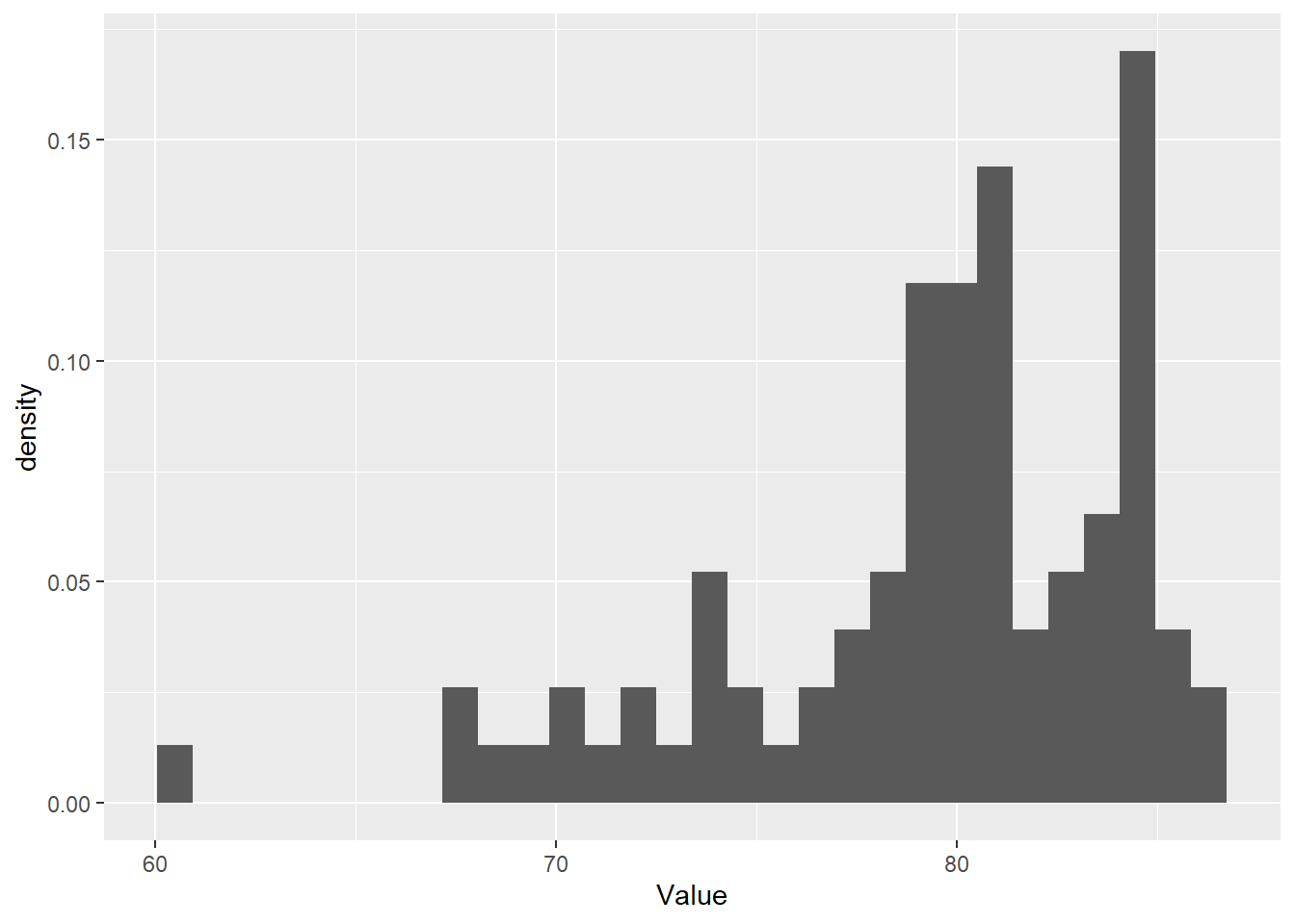 Τι δείχνει ένα ιστόγραμμα και ειδικότερα το συγκεκριμένο; Παρατηρούμε ότι οι τιμές της μεταβλητής Value του πίνακα P_Z, δηλαδή το προσδόκιμο ζωής κάθε χώρας, παίρνουν τιμές σε ένα συνεχές φάσμα. Ως εκ τούτου είναι απίθανο να βρούμε έστω και δύο χώρες με ακριβώς ίδιο προσδόκιμο ζωής. Όμως δεν θα είχε ιδιαίτερη αξία ένα ραβδόγραμμα που θα έδειχνε πως μία χώρα έχει προσδίκιμο ζωής τα 85,9 χρόνια, 2 άλλες τα 85,7, μία άλλη τα 85,6 κτλ. Έτσι δεν είναι; Θα ήταν πιο χρήσιμο το ύψος της κάθε μπάρας να δείχνει π.χ. πόσες χώρες έχουν προσδόκιμο ζωής 60-65 χρόνια, πόσες 65-70 χρόνια, πόσες 70-75 χρόνια κτλ. Ε, αυτό ακριβώς κάνει το ιστόγραμμα!