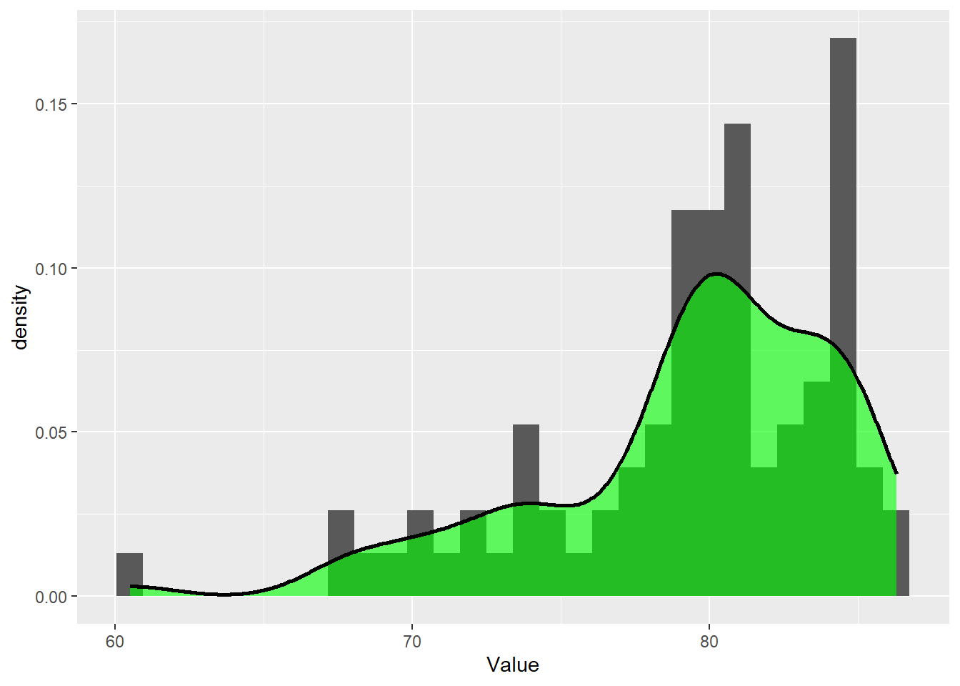 geom_density(linewidth = 1, alpha = 0.6, fill = "green")