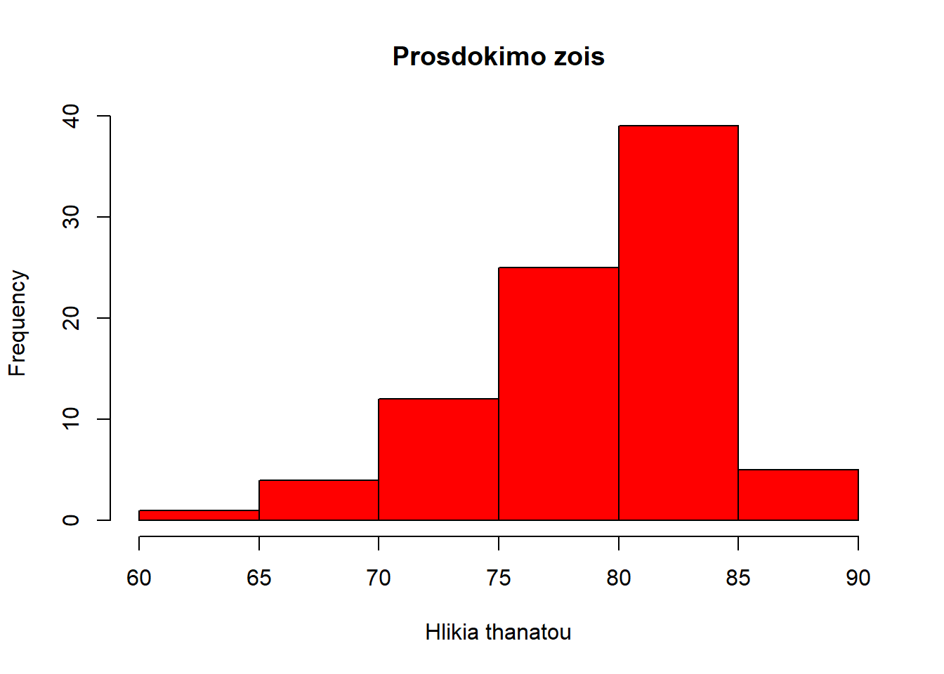 hist(P_Z, col="red", xlab="Hlikia thanatou", main="Prosdokimo zois")