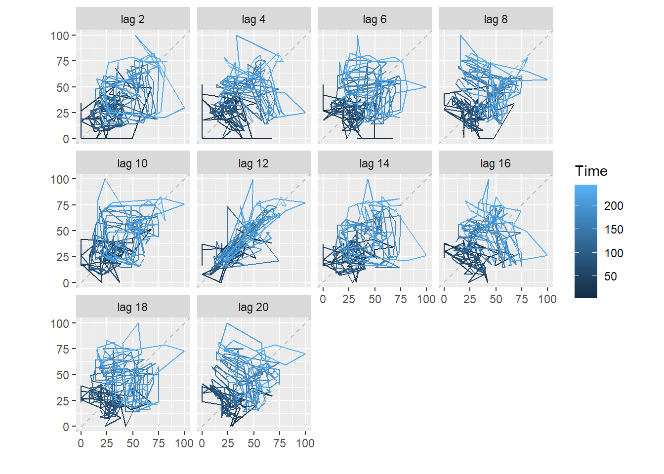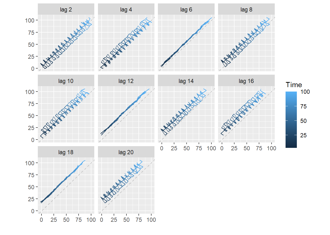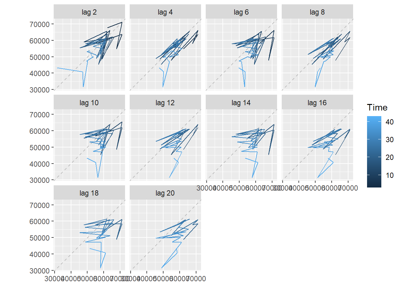 gglagplot(massExt, continuous = TRUE, set.lags = 2*(1:10))