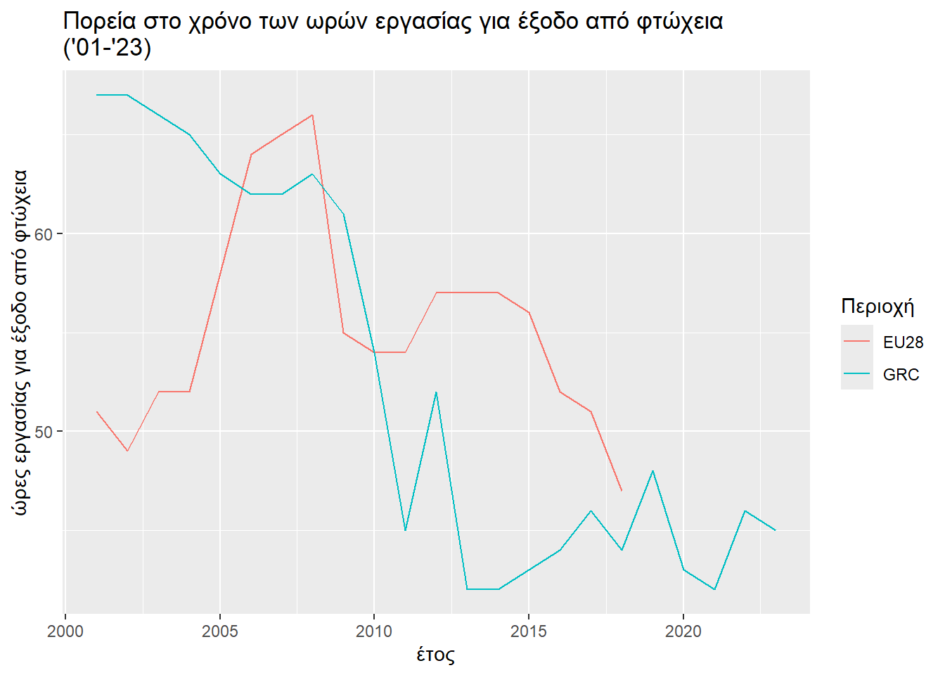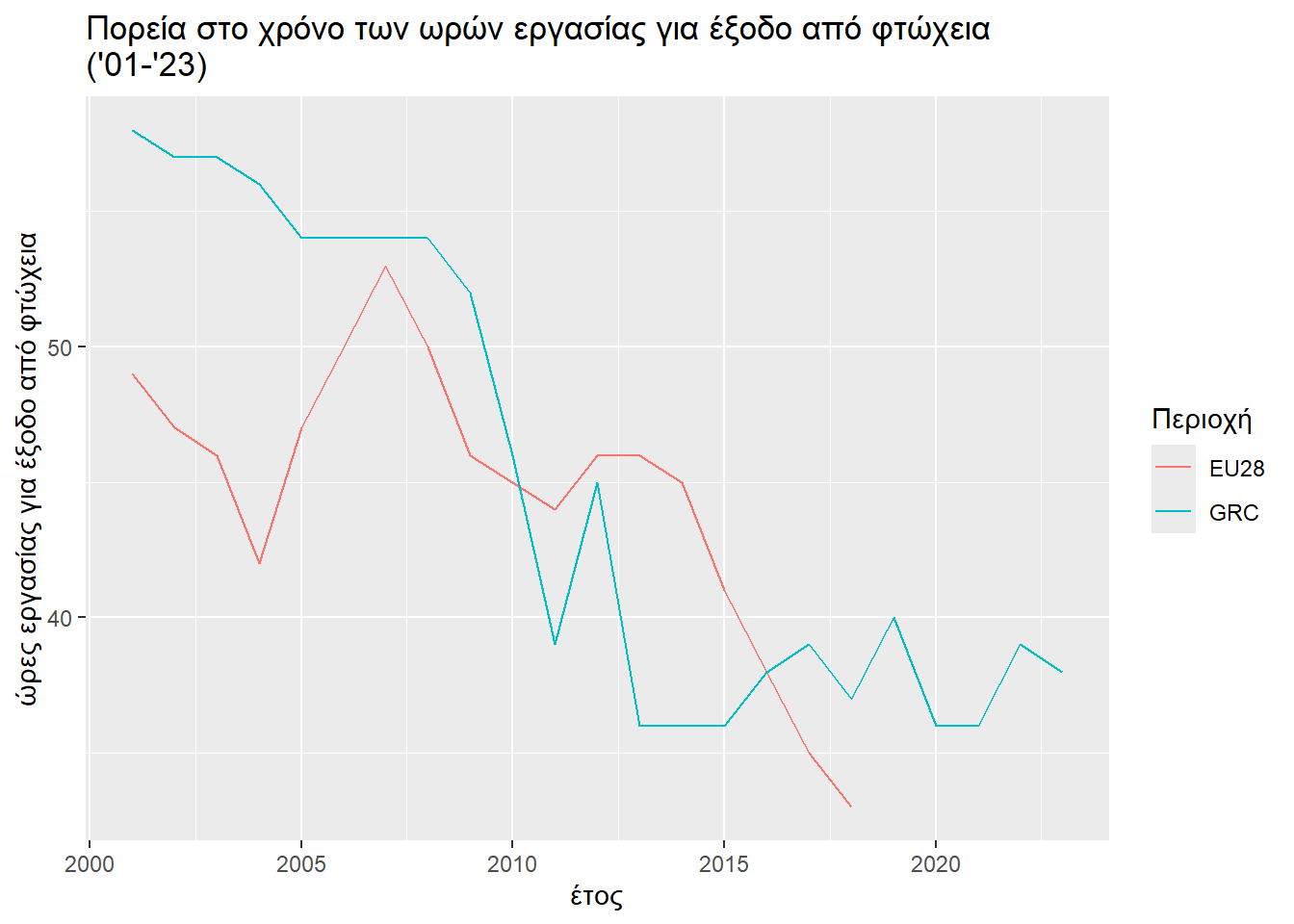 Ας δούμε πρώτα την περίπτωση που ένα ζευγάρι έχει 2 παιδιά. Όσον αφορά την περίπτωση της Ελλάδας και της Ε.Ε., φαίνεται ν’ ακολουθούν μια σταθερή μετά από μια πτωτική πορεία οι ώρες εργασίας που απαιτούνται για την έξοδο από την κατάσταση της φτώχειας. Είναι αυτό σημάδι επικείμενης ανόδου, καθόσον πλησίον ενός ελαχίστου οι μεταβολές είναι ανεπαίσθητες; Θέλουμε μελλοντικά δοδομένα γι’ αυτό. Είναι μήπως η πτωτική πορεία τμήμα ενός ευρύτερου σκαμπανεβάσματος; Θέλουμε παλαιότερα δεδομένα γι’ αυτό.