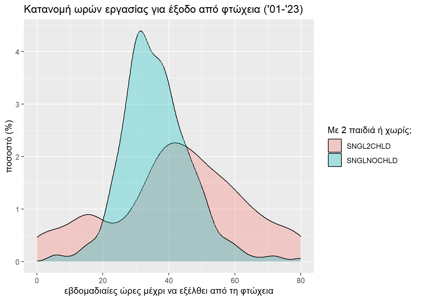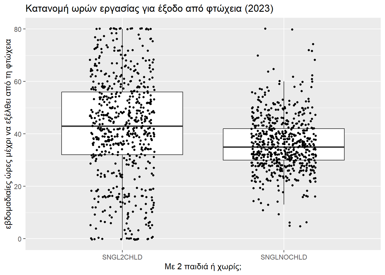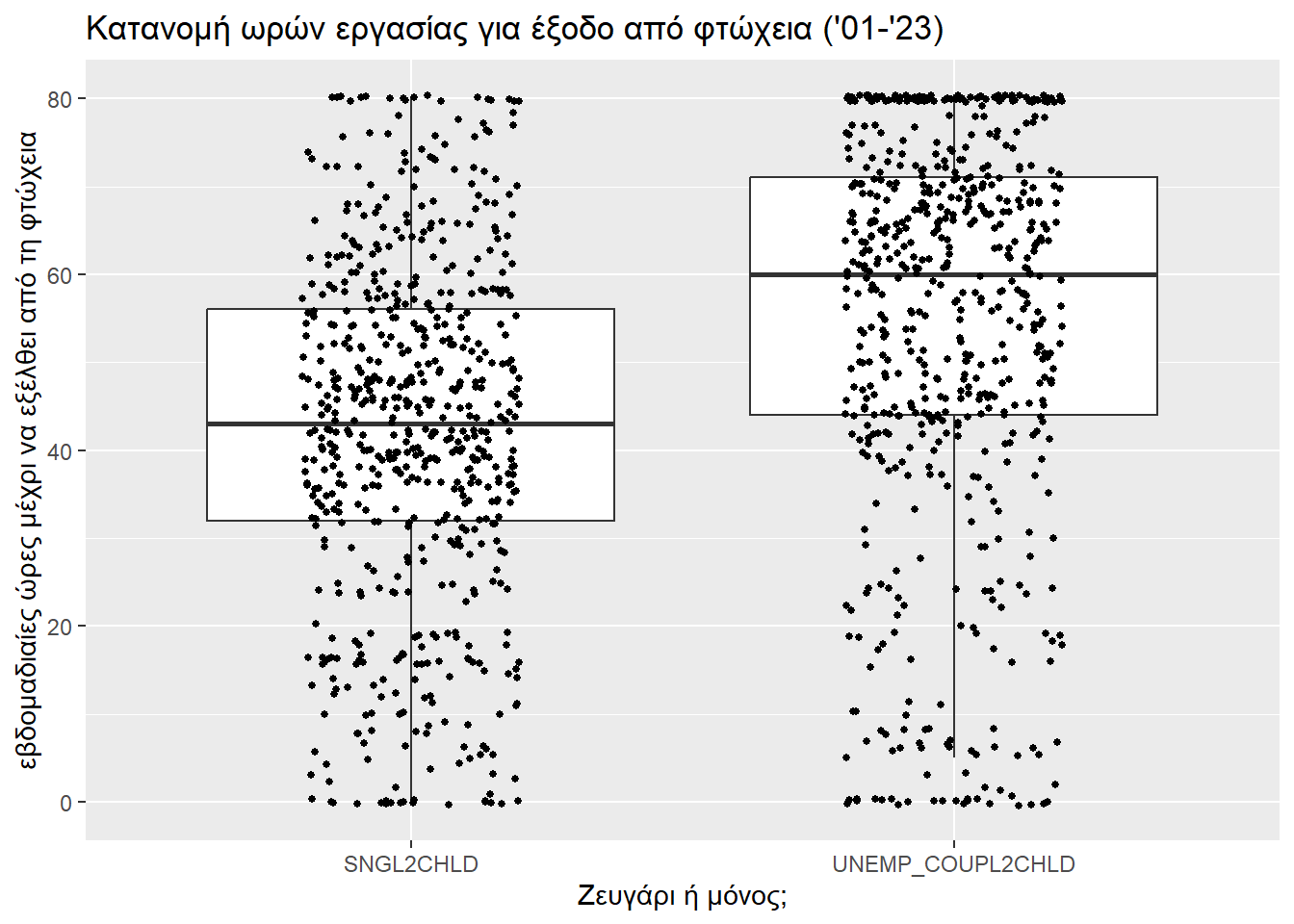 Το r του Wilcoxon (0.2285096) πάλι διλώνει μικρό προς μεσαίο μέγεθος επίδρασης της ύπαρξης παιδιών στη δυσκολία εξόδου από τη φτώχεια. Βέβαια, είναι σαφώς μεγαλύτερο από την περίπτωση που μελετούσαμε ζευγάρια, κάτι που αντικατοπτρίζει και τις δυσκολίες που αντιμετωπίζει μια μονογονεϊκή οικογένεια.
