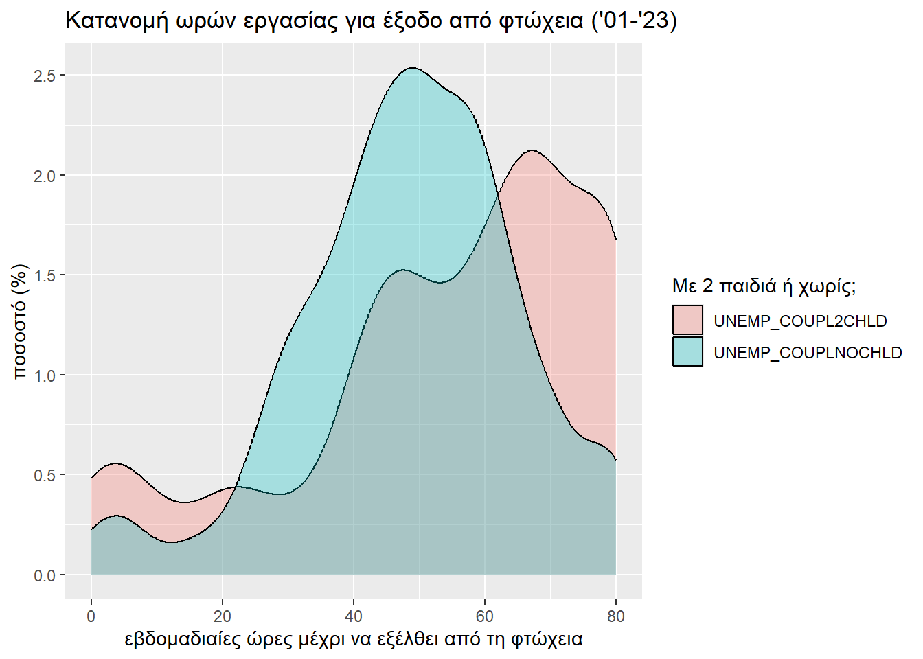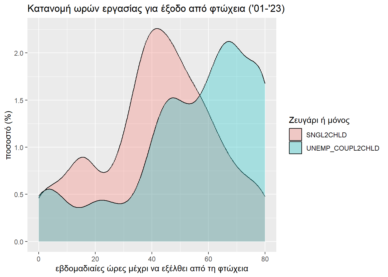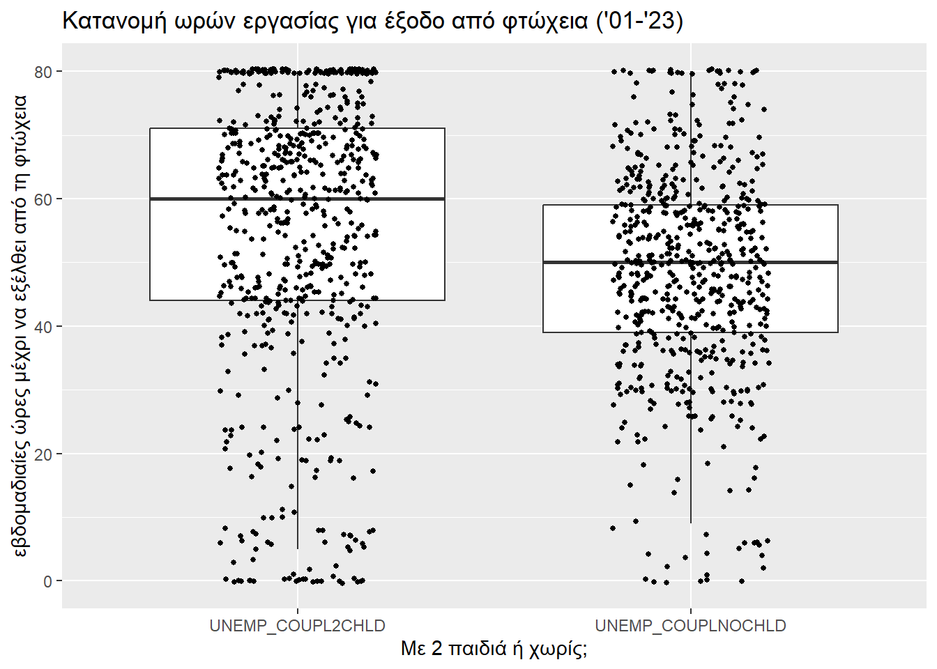 Το r του Wilcoxon (0.2285096) πάλι διλώνει μικρό προς μεσαίο μέγεθος επίδρασης της ύπαρξης παιδιών στη δυσκολία εξόδου από τη φτώχεια. Βέβαια, είναι σαφώς μεγαλύτερο από την περίπτωση που μελετούσαμε ζευγάρια, κάτι που αντικατοπτρίζει και τις δυσκολίες που αντιμετωπίζει μια μονογονεϊκή οικογένεια.