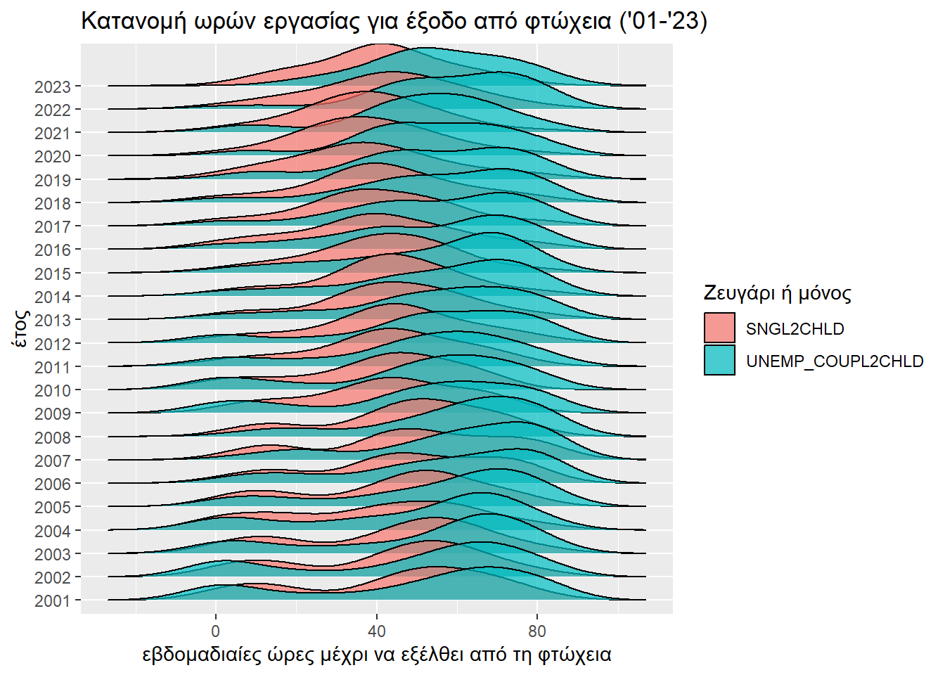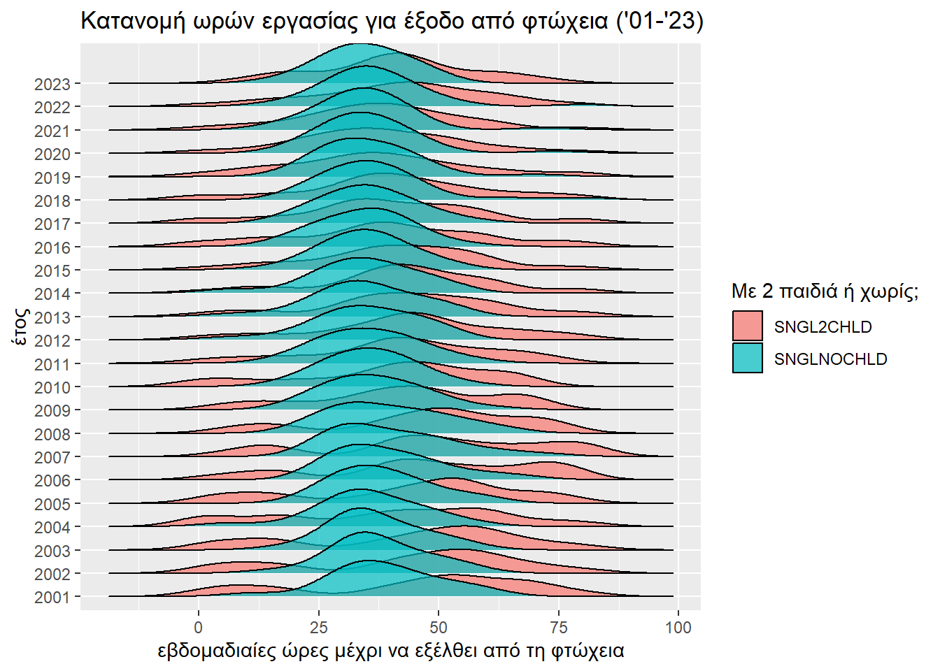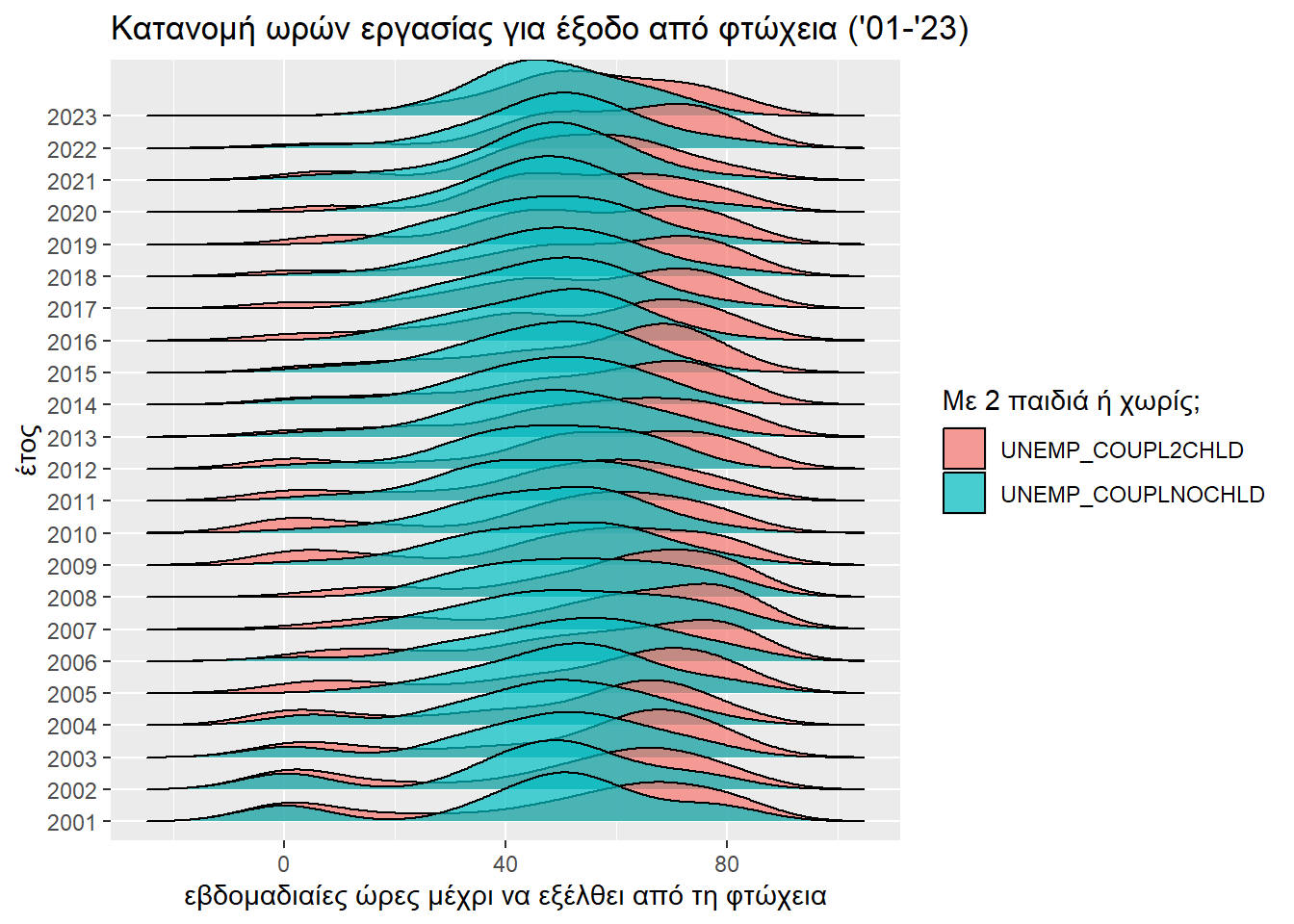 Και πάλι κάνουμε μια οπτική παρουσίαση της εξέλιξης της επίδρασης του παράγοντα «έχω δύο παιδιά ή καθόλου» στη δυσκολία εξόδου από τη φτώχεια.