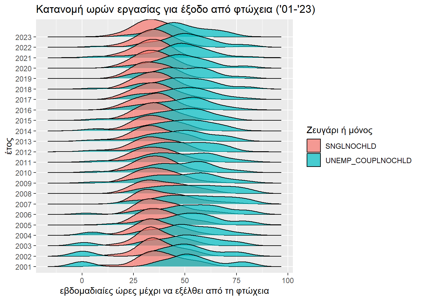 Τέλος, παρουσιάζουμε την εξέλιξη στην πάροδο του χρόνου της διαφοροποίησης μεταξύ του να είναι κανείς μόνος ή ζευγάρι.